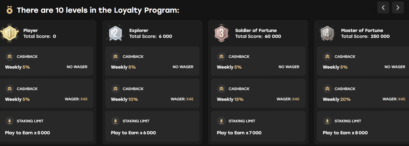 The Fairspin loyalty program features a comprehensive ranking system (including Explorer, Warrior, and Gladiator, leading up to VIP). Reaching each level unlocks new perks and bonuses that help you enjoy the game even more. As players move forward, they can acquire higher-value rewards. The following table illustrates the key rewards associated with the main tier brackets:
